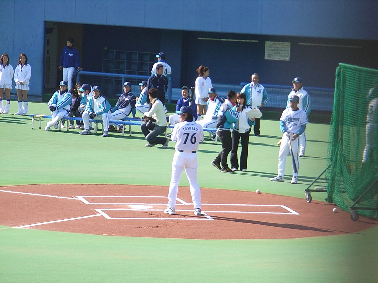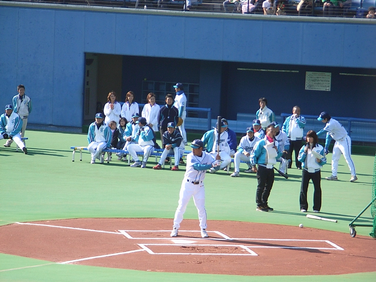 野球の生観戦できる試合が大阪の日本選手権ぐらいしかないので、 シーレックス・フェスタというファン感謝デーを観に横須賀へ。 はじめてファン感謝デーに行ったけど、正直自分には何か物足りない。 選手とファンの触れ合いの出来るイベントだけれど、 自分はプレー(や道具)に興味があってサインにはあまり興味が無いので若干退屈。 昼にやっていた桑原と高森のトークショー(特に高森のモノマネはかなり良かった)を観て早退。 午後からはグランドに入れるけれど、春にも一度入ったしそこまで居るほどの魅力が感じられなかった。 今回のフェスタの収穫は子供の頃何度も観た横浜大洋ホエールズの主力。 “ オバQ ” こと 田代監督と “ とっつあん ” こと高木コーチのHR競争が観れた事と 打撃の評判も良い高校ドラフト1位の北のバッティングが観れた事。 右投げ左打ちだったのを今日知った。 いくらバッティングが良いといってもまずは投手で何とかしてもらわないと。 打者転向するような事になったらこの写真も良く観る光景になっちゃうから。