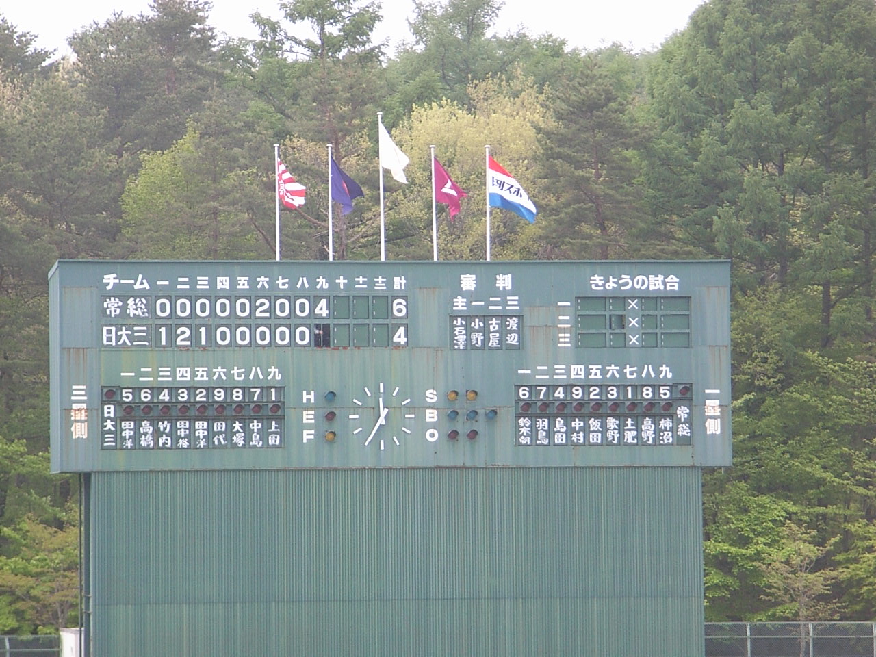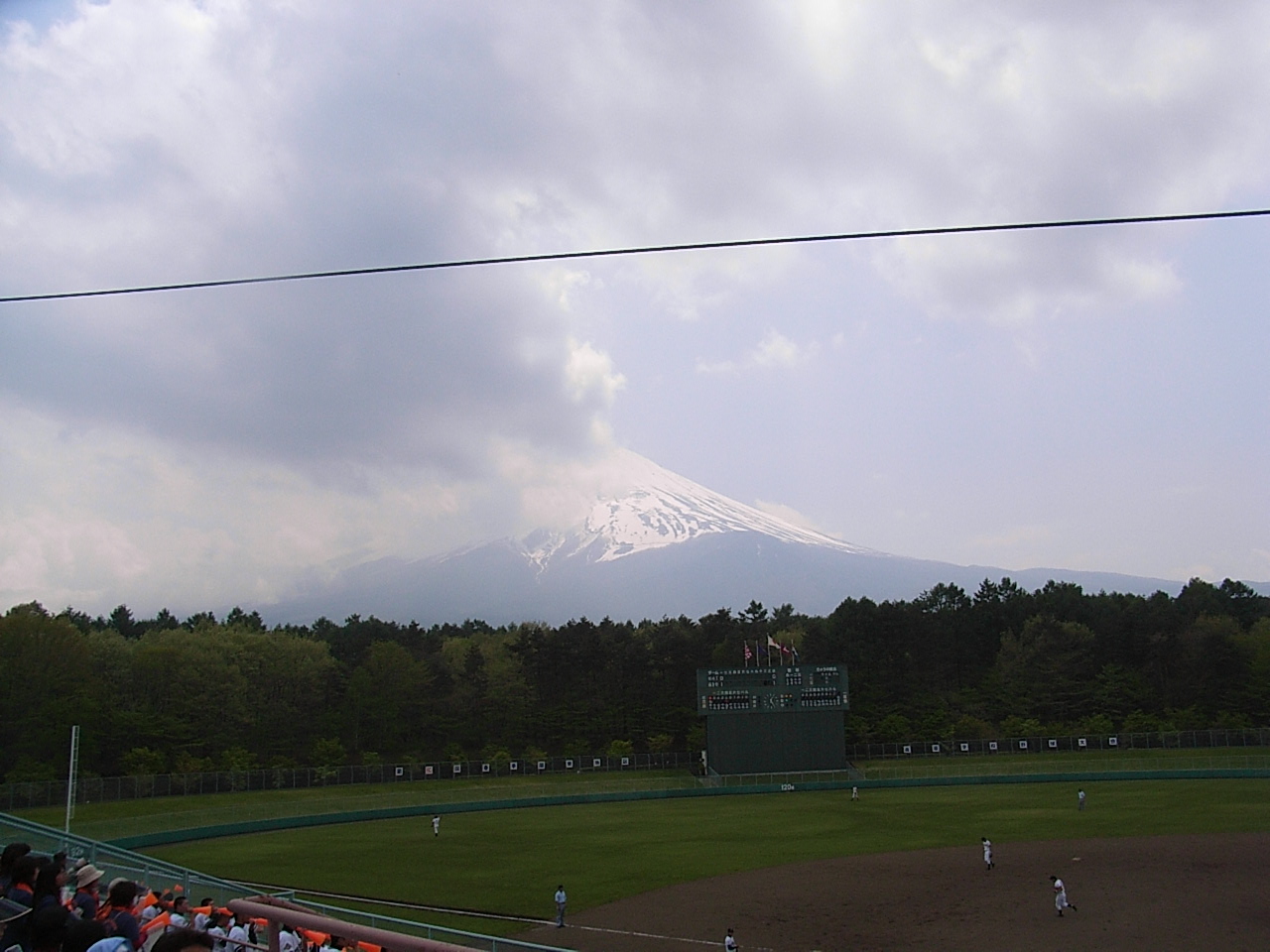 今年の3大観に行きたい野球場 その2 である富士北麓球場で関東春季大会を観戦。 この球場の特徴はセンター後方に富士山が観られる 球場マニアにとっては一度は行きたい球場。 今日は雨の心配のないほどのいい天気。 でも着いてすぐ確認した富士山は雲がかかって何処にあるかまったく判らない。 時間がたつとだんだん雲がとれてきて昼前には富士山を確認。 ただ、昼飯の “ よしだのうどん ” を食べに球場を離れている間が一番綺麗観えていた。 戻って観えた富士山がこれ。 残念ながら借景の富士山は半分くらいだけ。 春先より秋口の方が雲が少ないかもしれないから 今度山梨で秋季大会がある時また来ようかな。 第1試合は常総VS日大三 シートノックの時は常総の方が上手く観えたけれど、試合前半に常総がエラー連発で失点。 そのたびにエラーの選手を交代させる木内監督。ミスをした選手にリベンジのチャンスを与えない。 個人的にはこういう選手交代は好きではないけれど、この厳しさが全国制覇につながったんだろう。 実際、日大三のチャンスでの選手交代になるので、攻撃のリズムを代える効果はあったかも。 試合は2点リードの9回に一挙4点取って6-4で常総の逆転勝利。 この試合で一番目立ったいたのは負けたけれど日大三のキャッチャー田中洋。 背番号12だし肩も強くないから控えの選手だと思うけど、バッティングはギャップを抜く良いバッティング。 勝っていれば間違いなく今日のMVPの活躍。 第2試合は前橋育英VS栃木工 うどんを食べに一旦外に出ていたので試合は2回途中から観戦。 試合は前橋育英の一方的なペース。余裕なのか背番号1の石田を5回で降板させても完封勝ち。 選手のまったく知らない両チームで前橋育英の4番サードの小板橋はいい動き。 4番を打っているくらいだから打力はもちろん脚も速そう。記憶の片隅に留めておくつもり。 試合は5-0で前橋育英。 第3試合は横浜VS千葉経大 横浜のエース土屋は連投の影響?なのかイマイチの出来。 それでも前の打席にHRを打たれた選手には三振を奪うなど気合で抑えるピッチング。 千葉経大のキャッチャーの肩があまり強くない事もあって横浜は盗塁連発。 千葉経大バッテリーも脚を警戒するので牽制が多くなったり間合いが長くなったりで試合時間も長め。 やっぱり脚を使えるチームは強い。 試合は3-5で横浜 去年の秋に観た時ほどの強さはなかったけれどそれでも接戦に勝つ強さがあった。 ただ、渡辺監督を含めてチーム全体で相手を威嚇するような野次の汚いチームの印象も受けた。 一塁牽制に対しては一塁手の動きがおかしいと一塁審判にも文句を言う。 影響はないと思うけれど、その後の際どいプレーはことごとく横浜有利の判定が出ていた。 第1試合で観た常総の木内監督同様こういった事も勝利につなげるんだろう。 ただ勝つためには何でもやる姿勢は共感できない。地元だけど横浜をあんまり応援したくは無くなった。