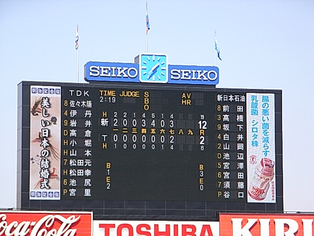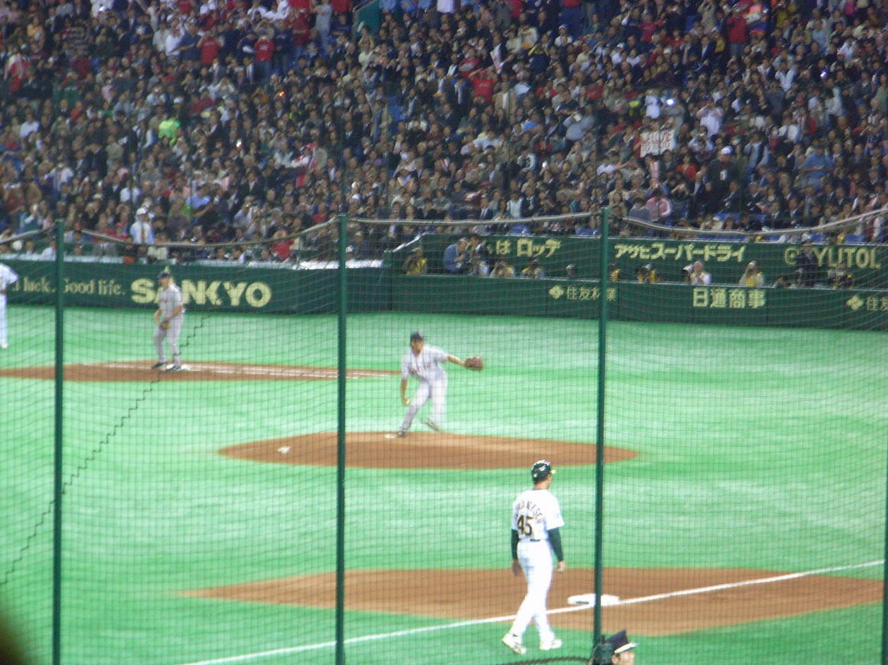 正直、松坂以外の先発を観たかった自分としては残念な試合。 その松坂も好投してくれればまだ良かったけどイマイチの内容。 とりあえず味方が逆転したから勝ち投手の権利を得て降板して リリーフしたシュナイダーが打たれて勝ち投手の権利が消えたので残念ムードはあったけど、 松坂がもっと球数を少なくして長いイニングを投げれればもっとましなリリーフ投手が出てきたんだから ある意味勝ちがつかなかったのは自業自得。 今日のスタメンで知らなかった選手はOAKのファーストのバートンとサードのハナハンに BOSのライトのモス。そのうちハナハンとモスは大活躍。チョット憶えておく。 でも今日の最大の収穫はチャンピオントロフィーが観れた事。 実物の小ささがかなりの驚き。結構ちゃっちいな。